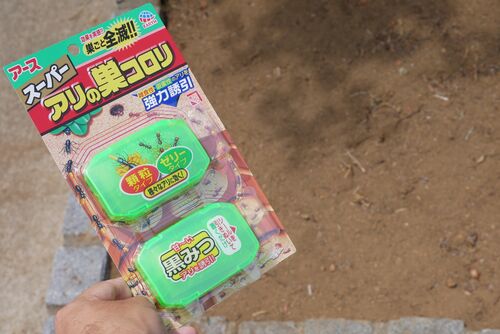 新たな実験 今日は先日必死で草をむしったスペースに実験として色々な植物を植えましょう。…と思いきや、蟻だらけ…必死に巣を作ってるグループが3つもあります。こりゃダメだ!と近くのドラッグストアに走りました。 コロリしてやります。屋外でも効果あるの…
